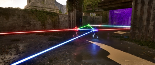 簡単そうに聞こえるかもしれないけど,パズルを解くには「ガジェット」の活用が必要不可欠。例えば,バリアの壁を停止させる「ジャマー」だったり,エネルギービームを別のジェネレーターへと導く「コネクタ」だったり,変わったガジェットがたくさん登場するんだ。ビームの色を混ぜて異なる色のビームを作り出す「RGBコンバーダー」なんてものもあるよ。