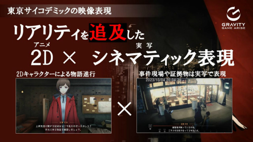 本作の映像表現は,リアリティを追求した2Dアニメと実写映像を融合した「2D×シネマティック表現」を標榜。物語の進行には2Dキャラクターを使用し,事件現場や物証などには実写映像を採用している。
