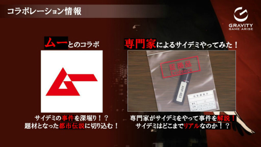 リリース後にも続々と話題を作っていくとのこと。オカルト情報誌「ムー」とのコラボレーションにより,本作がモチーフにしている未解決事件や都市伝説などを深掘りしていくことが発表された。