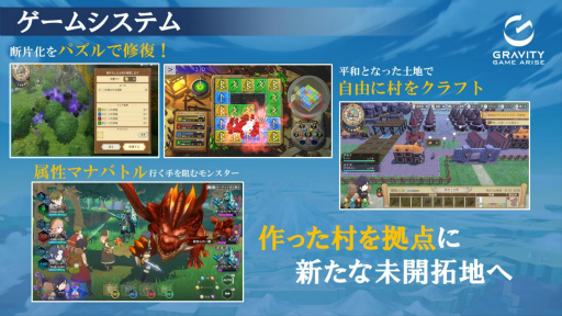 ゲームは大きく3つのパートに分かれており,まずは「色を揃えるパズルによって,断片化した土地を修復」し,「仲間にマナを付与して,属性マナバトルでモンスターを討伐」していく。そうして平和になった土地で「自由に村をクラフト」し,作った村を拠点に修復すべき新たな開拓地を目指す――というサイクルになっている。