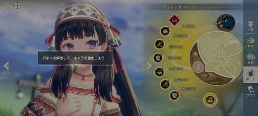 バトルに参加するキャラクターにはレベル,覚醒,グロウボードといった成長要素がある。覚醒はピースを集めて合成することで,☆の数が増えて強くなっていくもの。グロウボードはキャラクターにあった光玉を消費して,パネルを解放し,レベル上限やステータスを向上させられる。素材や経験値はデイリークエストで入手可能だ。