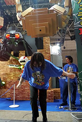 また,同社ブースでは巨大生物デカランチュラからの逃亡も体験できる。その内容は,デカランチュラが攻撃してくるまでにステップの上で足踏みした歩数を競うというもの。ラストではデカランチュラのお尻から糸ならぬ白い煙が吹きかけられる。煙はヒンヤリとしているので,暑い会場での気分転換に持ってこいだ。