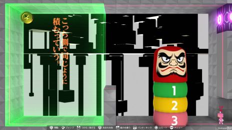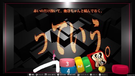 1枚目は特殊能力がない「凡人」のパンチで赤いのを叩いた場合。2・3 枚目は「潤滑」の能力発動時のパンチです。凡人ではだるま落としが崩れてしまったのに対し、潤滑の方は赤いのがスルッと!だるまが倒れることなくあっさり YOU DID IT!!