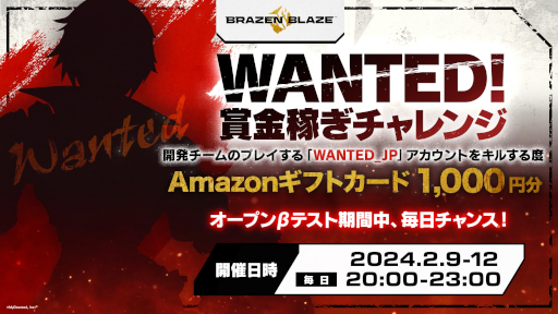『ブレイゼンブレイズ』のオープンβテストは、2024年2月13日12:59まで開催されています。「WANTED!賞金稼ぎチャレンジ!」で開発スタッフがプレイする「賞金首」を(ゲーム内で)殴り飛ばして、Amazonギフトカードをゲットしてください!!