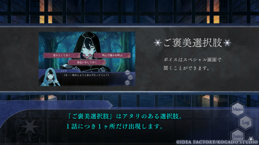 個別ルートの中盤に登場する「分岐選択肢」は,選んだ行動によって物語の展開が真相か闇堕か,どちらかに変化する,非常に重要なものだ。選択のチャンスは一度きりで,選んだあとは引き返すことができない。