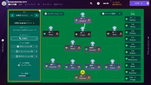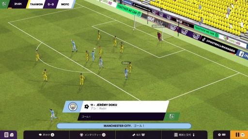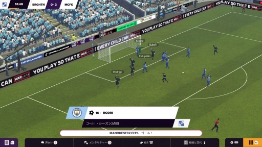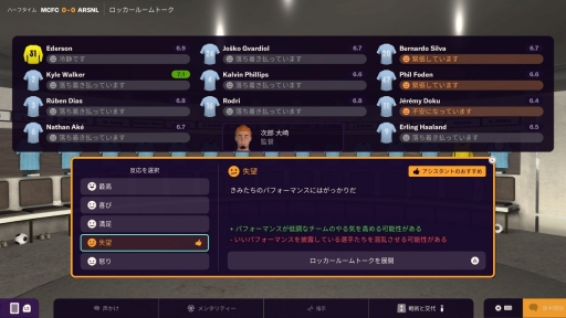 次から次へと変わっていく状況。今回のプレイでの私なんて,「映えるかな?」なんて理由でマンチェスター・シティFC(マンC)を選んだんですよ。世界最強チームのひとつですね。本来ならポルトガルのベンフィカあたりを取って,国内では強いけど欧州では中堅というプレイを楽しみたかったんだけど。まあそこは製品版に取っておきます。で,要はいわゆる「俺ツエー!」をするためにマンC取ったはいいが,ゲイム開始直後にいきなりMFデ・ブライネ,グリーリッシュ,DFストーンズの主力3人が怪我による長期離脱。謎の縛りプレイを余儀なくされました。結果,シーズンの半分をこなした時点でプレミアリーグ8位。解任ものですよコレ。