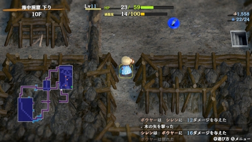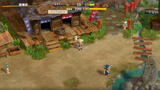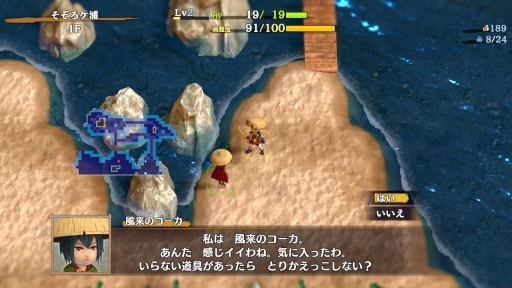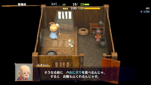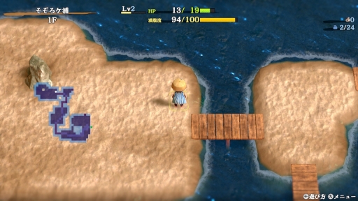 簡単な操作チュートリアルを終えると,探索の拠点となる宿場浜(しゅくばはま)から冒険が始まる。ゲームサイクルは,不思議のダンジョンシリーズではおなじみのもので,ローグライクと呼ばれるゲームの定番な遊び方だ。いわゆるパーマデスで,シレンが冒険の途中で倒れてしまうと,道具(アイテム)やお金といった持ち物をすべて失い,レベルも1になって,拠点である宿場浜からやり直しになる。