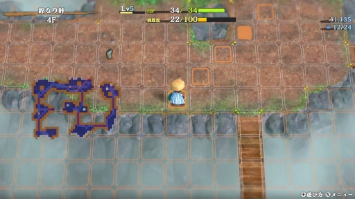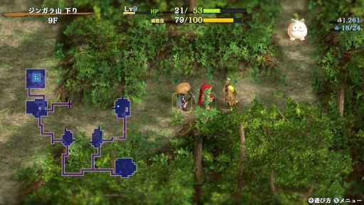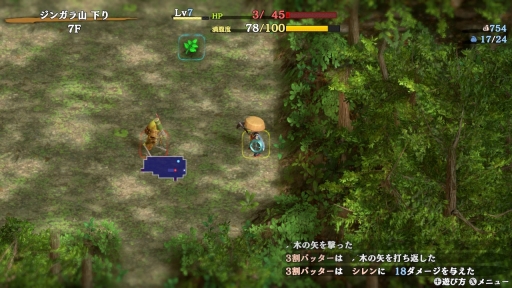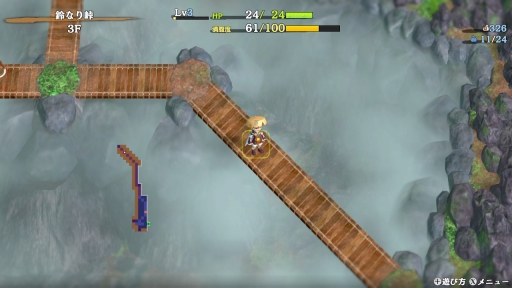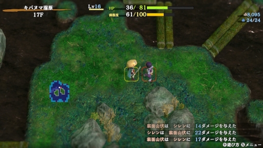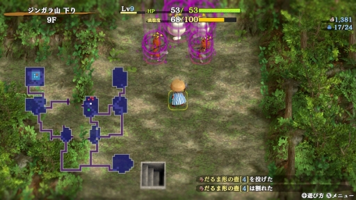 ダンジョン内は四角形(スクエア)のマス目で,こちら(シレン)と敵が交互にターン制で行動する。ダンジョンは入るたびに地形や敵の配置,落ちている道具が変化するといった,不思議のダンジョンシリーズの共通要素と言える部分はもちろん変わらない。プレイヤーは毎回違った環境に適応して,攻略を進めていく必要があるというわけだ。このあたりの基本の進め方はゲーム内でしっかり説明してくれるので,シリーズ初心者でも遊びやすいだろう。
