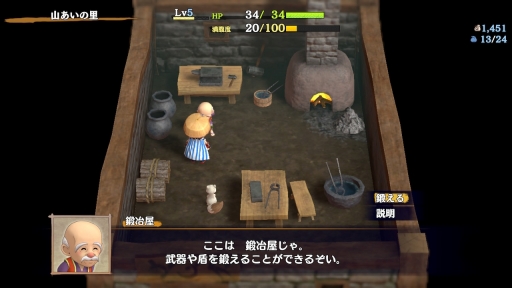 ダンジョンの序盤はけっこう穏やかで,大した難敵もおらずスルスルとクリアできる。ダンジョンを進んでいくと,ところどころに休憩ポイントがあり,最初のポイントである山あいの里では,鍛冶屋を利用し装備を強化できる。