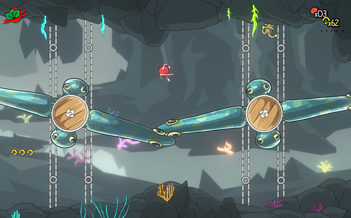 ブースに展示されているゲームデモは,そのハードコアな内容で話題になった2013年のスマホアプリ「Flappy Bird」(関連記事)と,「星のカービィ」シリーズを混ぜ合わせたような雰囲気を持っていた。プレイヤーは,ボタンひとつでレジ―にかかる重力を反転させて,空中に浮きながらさまざまな仕掛けを突破していく。