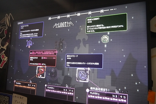 レイドボスを倒せれば,戦利品の分配タイムが始まる。戦利品として,ウサギのスキルに特殊な効果を付与する4種類の装備品が出現し,複数人が同じものを欲しがった場合は,ダイスの出目で所有権を争うことになる。