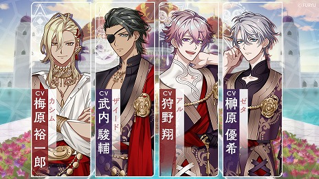 CVは、国を憂い意思を貫く王子「エドガー」を野島健児さん、スラム街の錬金武器商人「ジェイ」を花江夏樹さん、飄々と今を楽しむ策略家王子「ヒューゴ」を古川慎さん、美しく気まぐれな砂漠の王子「カシム」を梅原裕一郎さん、鳥籠の中の御曹司「クラン」を細谷佳正さんが担当。その他キャラクターのCVを務める豪華声優陣も合わせてホームページにて公開します。