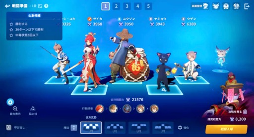 ![]() 戦術戦闘では,デッキに組み込んだ英雄5名を行動順に操作していく。オートプレイも可能だ |