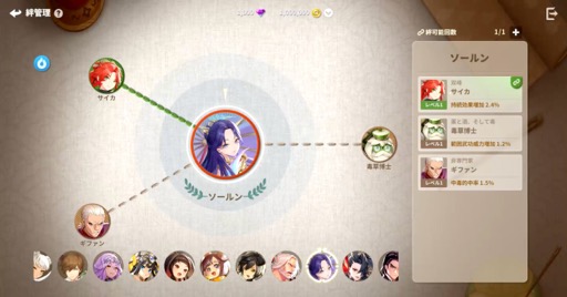 英雄のステータス画面では,ほかの英雄とのつながりを示す「絆」を確認できる。いずれかの絆を選択すると,2人の英雄がどういった関係なのかが分かるようなストーリーが表示され,スキル威力増加などバトルにおける有利な効果が発動する。この絆は,1人の英雄につき最大2つまで選択可能だ。