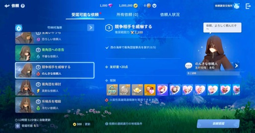 いわゆるデイリーコンテンツとしては「依頼」がある。具体的な内容は,依頼人の指示に従って特定のエリアにいる特定の敵を倒すというシンプルなものだが,重要なのは報酬に英雄の友好度が含まれているところだ。