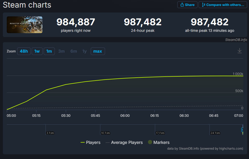 本日発売「モンスターハンターワイルズ」,リリースから約2時間でSteam版の同時接続人数が98万人を超える。Steam歴代8位を記録
