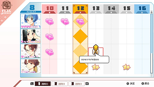 しかし,本作に搭載された「イージーモード」を使えば,その難度はぐっと下がる。プレイ中は,ヒロインの攻略状況を確認できる「FLAG SCHEDULE」を呼び出すことが可能で,さらに現在から明日以降に発生させられる必須イベントもチェックできる。