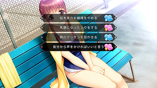 イベントの会話では選択肢が発生することもある。選択肢によっては好感度が下がり,以降のイベントやエンディングの内容に影響を及ぼすことも。攻略したいヒロインによっては,ほかのヒロインとのイベントを発生させておかなければ,グッドエンディングにたどり着けない場合もあるので,初見プレイでハッピーエンドを迎えるのは少々難しかったりする。