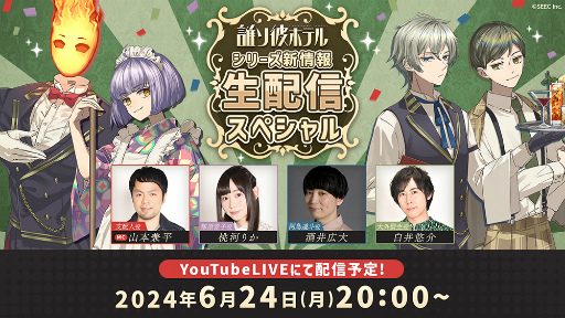 株式会社SEEC(代表取締役:阿部隆太郎、本社:東京都渋谷区)は、誰ソ彼ホテル公式YouTubeアカウントにて、「『誰ソ彼ホテル』シリーズ新情報生配信スペシャル」を2024年6月24日(月)20時〜配信予定であることを発表いたしました。