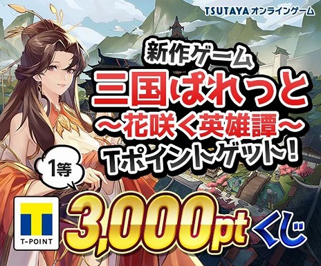 「三国ぱれっと〜花咲く英雄譚〜」のTSUTAYAオンラインゲーム版リリースを記念して、Tくじが開催中!1等はなんと3000ポイント!詳しくはTくじサイトをチェックしよう!