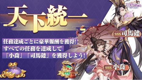 「天下統一」イベントではレベルアップ、ステージクリアや派遣などの数々の任務が与えられる成長と共に豪華報酬がイベントとなっています!さらに任務達成の進捗によって強力な英雄がもらえる超豪華イベント!