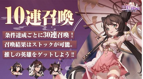 「10連召喚」イベントでは、キャラクターの作成から指定日数に応じ解放され、解放ごとに無料で30連召喚ができるイベント!召喚結果は3つまでストックが可能!好きな推し英雄を獲得できるチャンス!