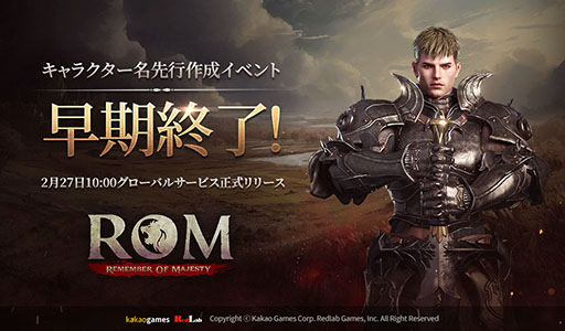[2024-02-21] RedLab Games(代表:シン・ヒョングン)は、自社が開発し、kakao Games(代表:チョ・ゲヒョン)と共にグローバル同時サービスを準備中の新作ハードコアMMORPG「ROM:Remember Of Majesty(以下、ロム)」のキャラクター先行作成イベントを盛況の元、早期終了しました。
