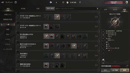 コレクション要素は,戦闘などで手に入る装備アイテムを使用して埋めていく「収集」もある。こちらは条件を満たすアイテムを消費して図鑑を埋めていくシステムで,集め終わると追加ステータスを獲得できる。装備アイテムの入手方法は簡単にチェックできるので,お目当ての装備がドロップする場所で放置するなど,狙って埋めていきたいところだ。
