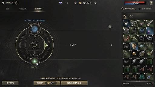 コレクション要素などでステータスを上昇させられるが,プレイヤーキャラクターを強くする際にもっとも効果があるのは,やはり装備強化だ。装備の強化は強化書を消費して行う。強化値が高くなってくると失敗率が上がり,失敗すると破壊されてしまう。また,装備に魔法を付与して新しい効果をランダムで追加することもできる。