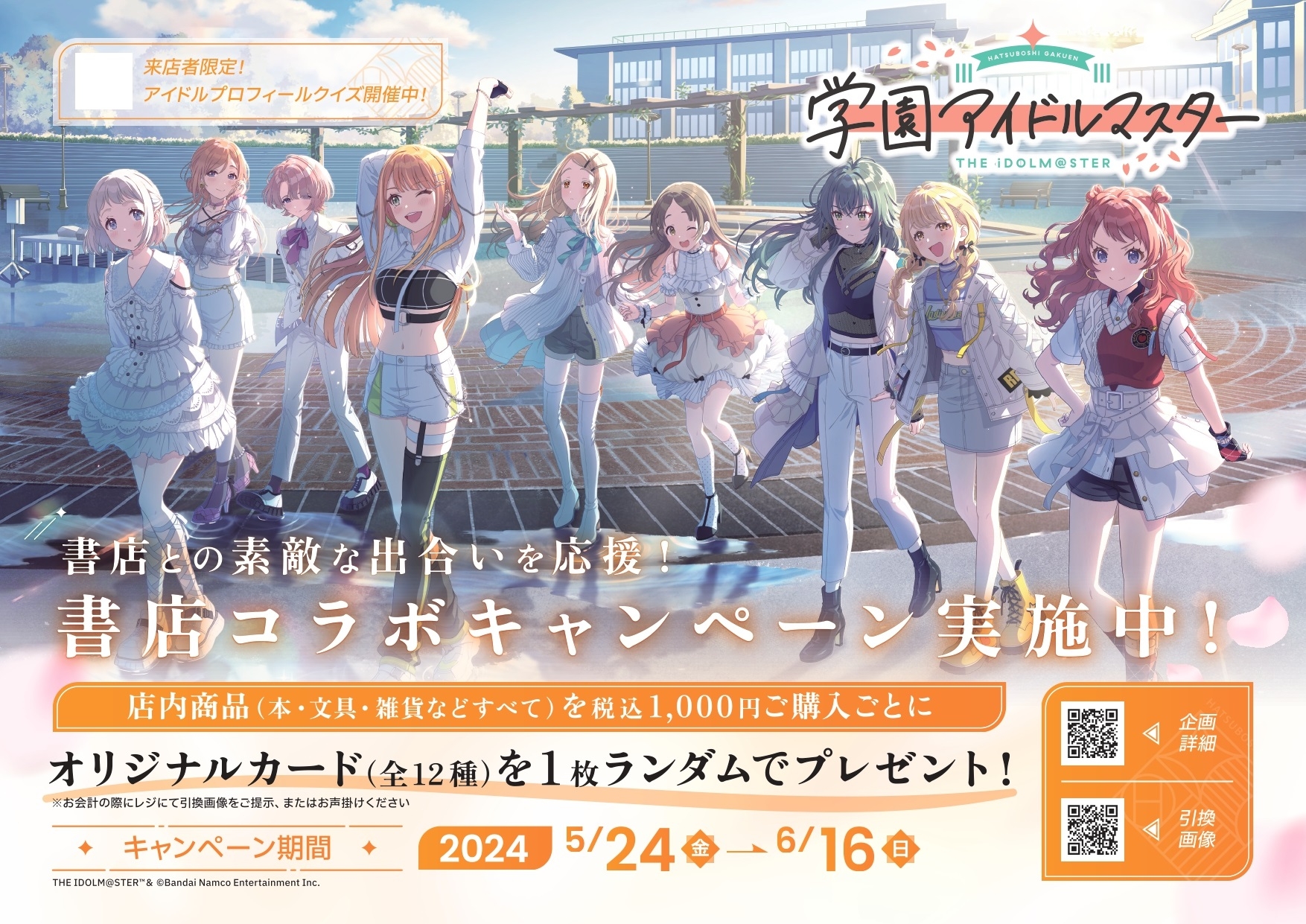 「学園アイドルマスター」と全国420の書店がコラボ。オリジナルカードのプレゼントキャンペーンを本日開始。アイドルプロフィールクイズも実施