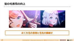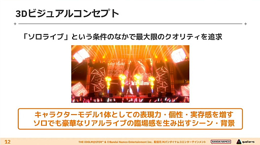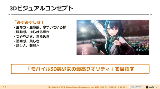 ビジュアルは「みずみずしさ」をキーワードとし,生命力や躍動感を与えられる“モバイル3D美少女の最高クオリティ”を目指したとのこと。また,複数人ステージと比べると絵的に地味になりがちなソロライブ形式において,キャラクター1体のクオリティを最大級に高めて実存感を増すことで,臨場感のあるライブ作りにつなげてきたそうだ。