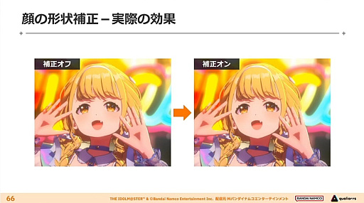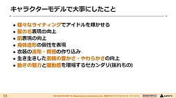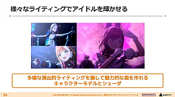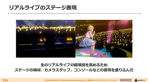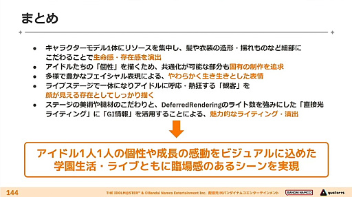 次いでポストエフェクトなどに触れたあと杉山氏は,キャラクターモデル1体へのリソースの集中をはじめ,揺れへのこだわりによる生命感の演出,アイドルたちをあえて共通化した作りにしないという個性の描き方,そして顔が見える観客を相手にリアルな機材を用いて作り上げるライブステージを演出することで,「アイドル1人1人の個性や感動,成長をビジュアルに込めることができたのではないか」と締めくくった。