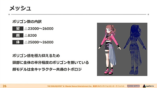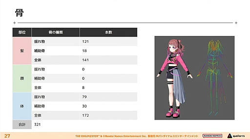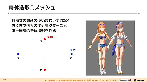 まずキャラクターの身体造形については,テンプレートを使い回すのではなく“個々の人物ごとに固有の形”で作成されている。筋肉・脂肪の量などはアイドルごとの設定に基づいて調節しているそうだ。
