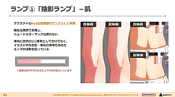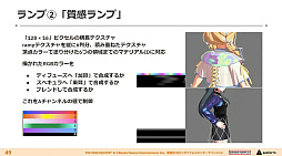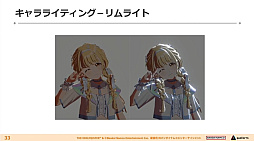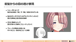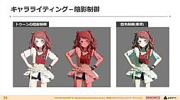 加えて「陰影ランプ」による肌などの質感向上。「質感ランプ」による服の質感の実装。前髪からの目の透け表現にシェーダを利用するなど,説明は駆け足ながらも,キャラクターのクオリティがどんどん高まっていくのが分かるビフォーアフター画像が披露されていった。