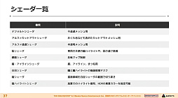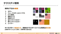 シェーダ・マテリアル・テクスチャの細かい仕様は以下のスライドのとおりだが,キャラクター1体あたりにシェーダ9種類,マテリアル9〜11種類,テクスチャ8種類が利用されている。