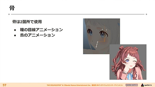骨は瞳の目線アニメーションと舌のアニメーションに使われており,瞳は単純な回転の一方,舌は移動・回転・スケールも開放され,自由に動かすことができる。ブレンドシェイプはメッシュごとの処理になるので形状処理のコストが高いが,GraphicsBufferを使ってスキニングを独自実装することで,その問題を回避しているそうだ。