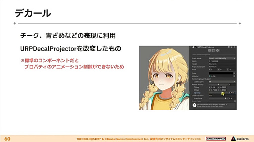 デカールはチークや青ざめの表現に使われている。基本はUnityの標準のプロジェクターだが,アニメーション制御などの対応できない点については,一部を改変して利用しているという。デカールそのものは表情だけでなく,背景などにも多用していると述べられた。