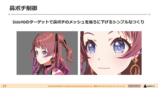 これはいわゆる“鼻ポチ”と呼ばれる,キャラクターを正面に捉えたときに表示される鼻のメッシュ調整にも応用されていて,横から見るときは悪目立ちしないようメッシュを後ろに下げる仕組み……とのことだ。