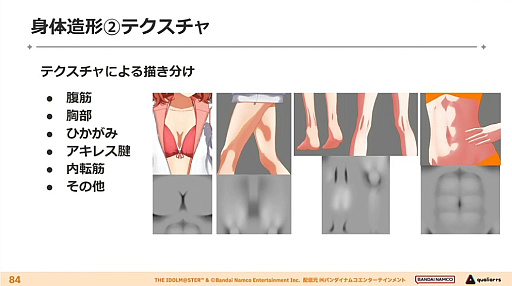 見栄えに直結するテクスチャの描き分けも行われている。腹部や内転筋などの部位に存在感を付加することで,ライブ時の一層のリアリティ向上に寄与させているという。ただし,リアルすぎるのもよくないため,適度にアニメ的なウソの表現を加えるのも重要だと語っていた。