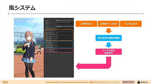 力がより発生しやすいのは上下の移動なので,そのまま動かすと揺れが見えにくくなる。そのため,縦の力を横の力に変換することで,理想に近い揺れ方を生み出した。さらに「風システム」という,横風で髪や服装を意図的に揺らす仕組みも作ってしまった。本当に妥協がない。