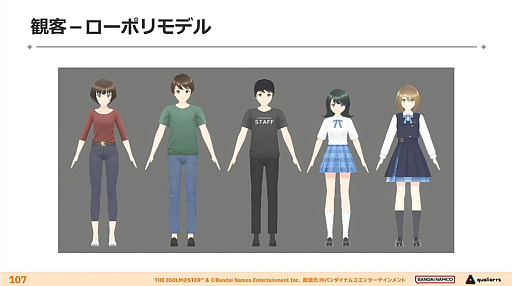 ライブの観客もまた追求対象だ。見原氏によると,群衆は大きく分けて「ローポリモデル」と「群衆システム」で制作されている。前者は約3000ポリゴン,後者は500〜1000ポリゴンと違いがあるが,ここでは数が必要か,拡大時の質が必要かなど,要求ごとに切り替えているらしい。