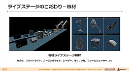 最後に杉村氏は,「リアルライブらしいステージ表現」について解説した。学マスではステージ機材やカメラスタッフなどの表現を盛り込んだだけでなく,実際にライブチームがそれらを配置し,そのうえでモデルチームが機材をつなぐ配線まで再現するという手間をかけたようだ。