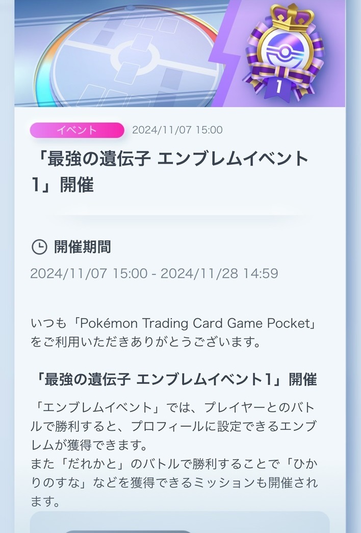 「ポケポケ」,バトルの勝利数に応じてエンブレムが獲得できるイベント“最強の遺伝子 エンブレムイベント1”をスタート