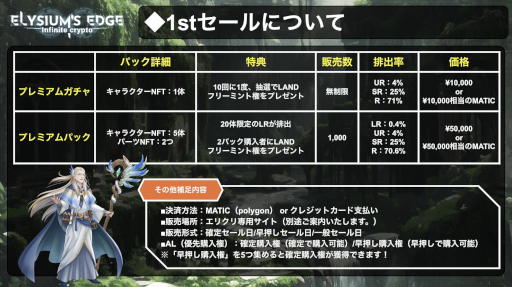 価格は,キャラクターNFT1体が手に入る「プレミアムガチャ」が1万円(税込),キャラクターNFT5体とパーツNFT2つがセットになった「プレミアムパック」が5万円(税込)。後者は1000パック限定となっている。