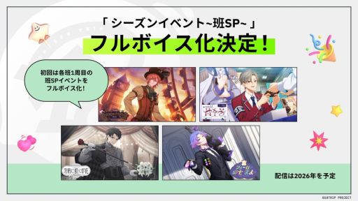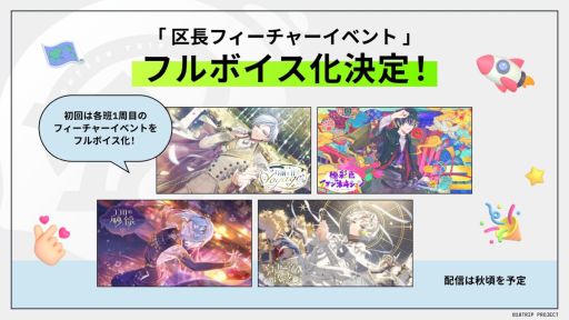 各区長たちに焦点を当てた「区長フィーチャーイベント」と、各班を中心にストーリーが展開する「シーズンイベント(班SP) 」のフルボイス化が決定しました。