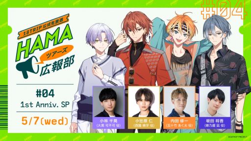 「HAMAツアーズ広報部 #04 1st Anniv. SP」が,5月7日に配信予定だ。番組には,大黒可不可役の小林千晃さん,西園練牙役の小笠原 仁さん,五十竹あく太役の内田修一さん,蜂乃屋 凪役の坂田将吾さんが出演する。