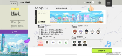 まずは,ホーム画面右下にある「おもてなしバトル」をタップし,好きなスポットを選択します。「出発準備」では,区長カードを10人編成しますが,それぞれに役割があるため,各スポットに合わせた編成が重要です。