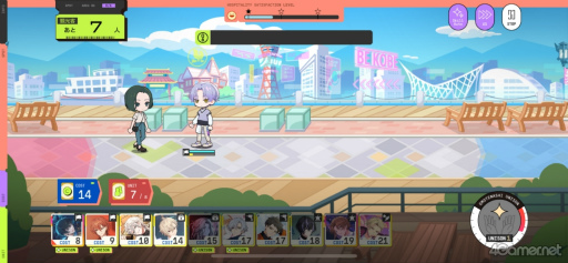 「開始」を押すとバトルがスタートします。画面下部に表示された区長カードを,スライド操作でマップ上に配置していきましょう。配置された区長たちは,マップ上を歩いてくる観光客に対して“おもてなし”を実行します。制限時間内に,より多くの観光客を満足させましょう。