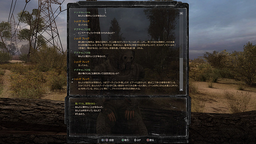 一癖も二癖もあるNPCとの会話に耳を傾け,物騒かつグロテスクなミュータントとの戦いに挑み,アイテム回収に励み,時に騙し,時に騙され,時に人助けをし,時に嵌められる。プレイヤーは決して万能の神ではなく,あくまでZONEで活躍したりしなかったりする,一人のストーカーに過ぎない。生態系の一つなのだ。