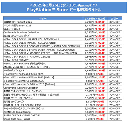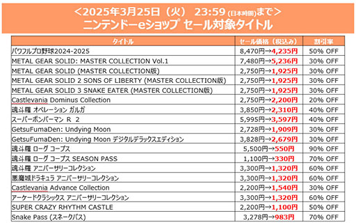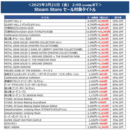 株式会社コナミデジタルエンタテインメント(以下、KONAMI)は、PlayStation Store、ニンテンドーeショップ、Steam Storeで、ダウンロード版のゲームをお得に購入できる「Spring SALE」を開催中です。